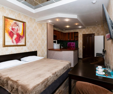 Номер с одной двуаспальной кроватью. В номере есть все необходимое для вашего удобства: светонепроницаемые шторы, чай, кофе, чайник, отдельный санузел, душевая кабина, средства личной гигиены, фен, две пар одноразовых тапочек, халаты, ЖК-телевизор и бесплатный Wi-Fi.